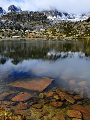 Reflection of snowy Pyrenees mountains on a lake. Andorra.